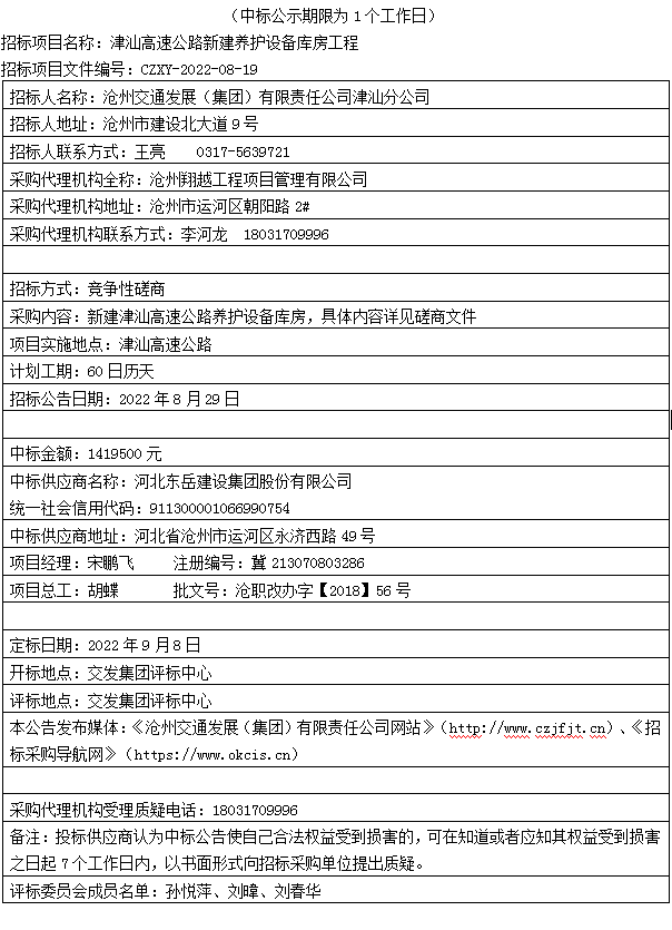 津汕高速公路新建養(yǎng)護設(shè)備庫房工程中標公告