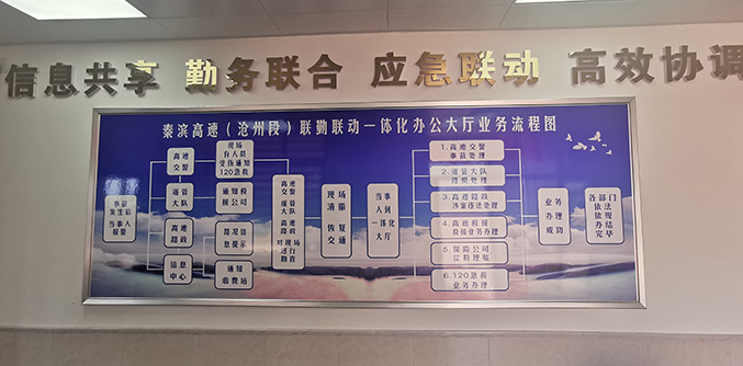“一體化服務(wù)中心”是河北省第一家“一路六方”聯(lián)勤聯(lián)動(dòng)辦公中心,是集河北高速交警滄州支隊(duì)、滄州市交通運(yùn)輸綜合執(zhí)法支隊(duì)、滄州交發(fā)集團(tuán)道路管理分公司、河北春林救援公司、滄州市平安保險(xiǎn)公司、黃驊骨科醫(yī)院120急救中心六部門(mén)共同組建而成的合署辦公中心,全面負(fù)責(zé)秦濱高速(滄州段)道路管理、安全救援、事故處理、保通保暢等工作,秉持“只跑一趟路、只進(jìn)一扇門(mén)”的服務(wù)理念,致力打造集交通案件、路政案件、路產(chǎn)賠付、車輛救援、車輛保險(xiǎn)、醫(yī)療救助等相關(guān)業(yè)務(wù)為一體的標(biāo)準(zhǔn)化服務(wù)體系,真正架起優(yōu)質(zhì)服務(wù)連心橋,實(shí)現(xiàn)為民服務(wù)更貼心。