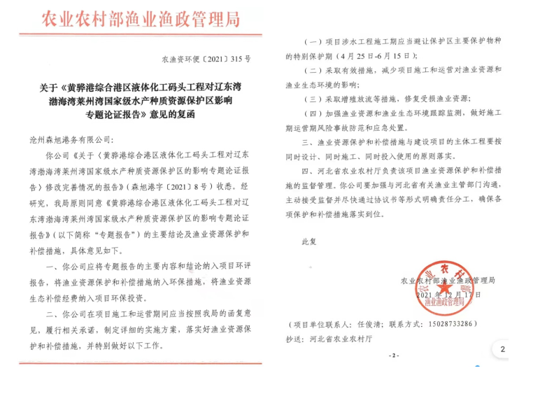 近日,《黃驊港綜合港區(qū)液體化工碼頭工程對遼東灣渤海灣萊州灣國家級水產(chǎn)種質(zhì)資源保護(hù)區(qū)影響專題論證報(bào)告》取得了農(nóng)業(yè)農(nóng)村部的批復(fù)。農(nóng)業(yè)農(nóng)村部批復(fù)的取得加快了液體化工碼頭工程項(xiàng)目前期手續(xù)跑辦的進(jìn)度,為項(xiàng)目開工建設(shè)奠定了堅(jiān)實(shí)基礎(chǔ)。