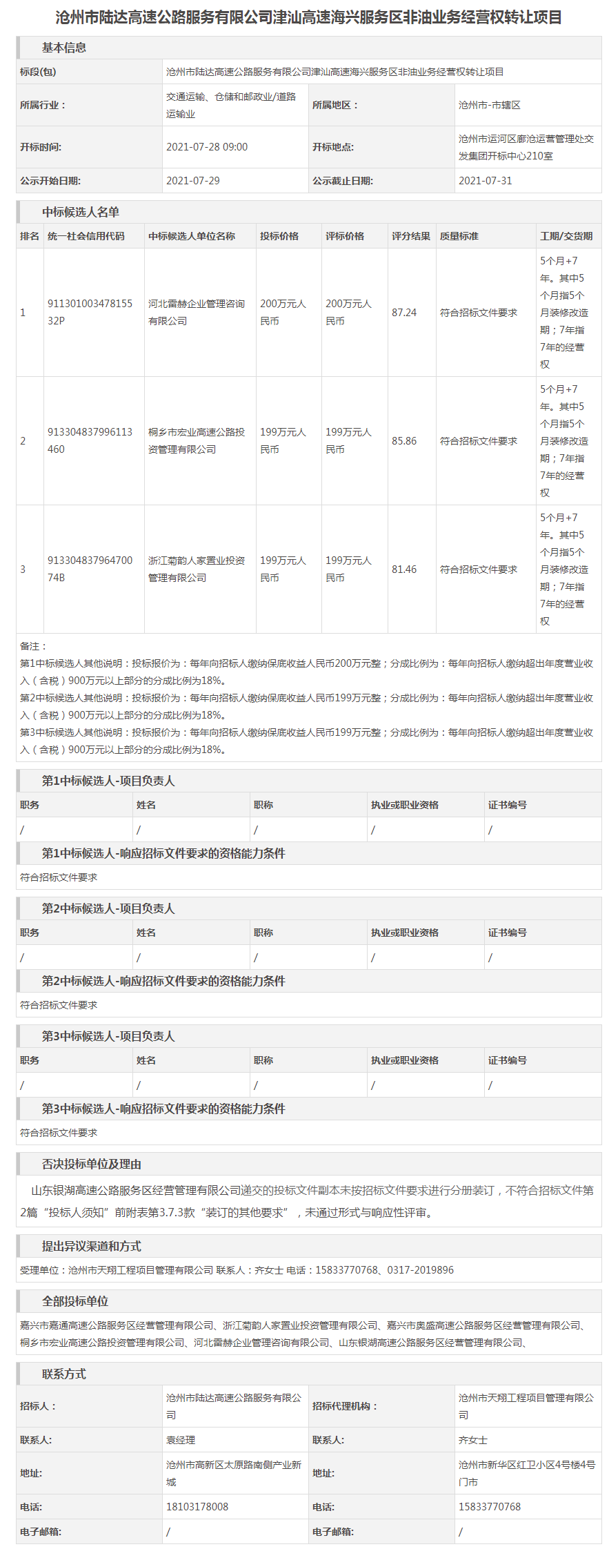 滄州市陸達(dá)高速公路服務(wù)有限公司津汕高速海興服務(wù)區(qū)非油業(yè)務(wù)經(jīng)營(yíng)權(quán)轉(zhuǎn)讓項(xiàng)目中標(biāo)結(jié)果公示