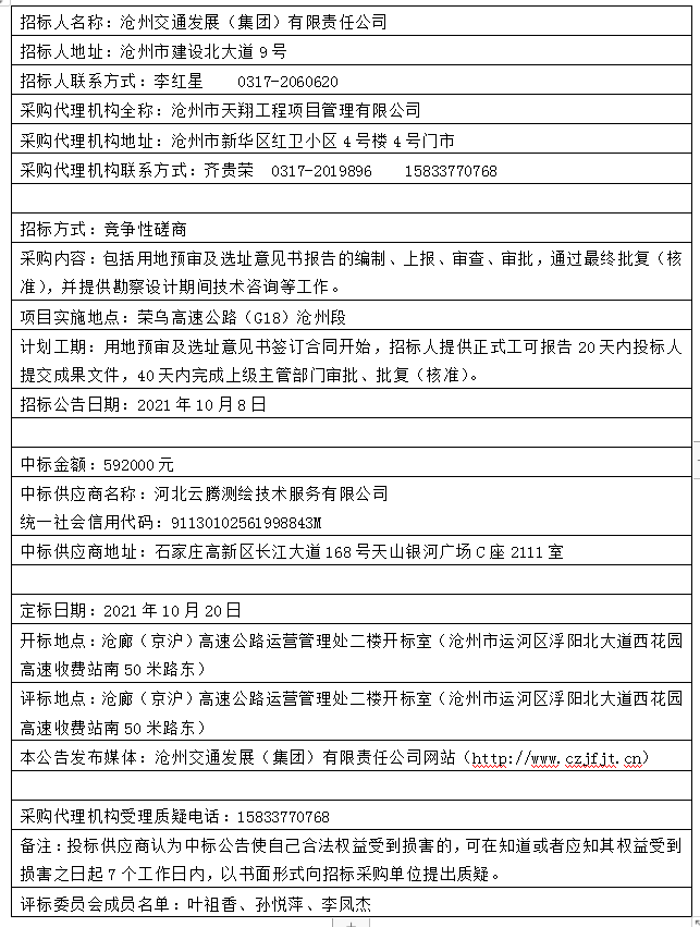 招標(biāo)項(xiàng)目名稱:榮烏高速公路(G18)滄州段改擴(kuò)建工程用地預(yù)審及選址意見書編制單位采購