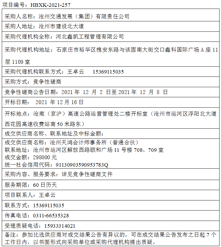 滄州交通發(fā)展(集團)有限責任公司 2021年度財務(wù)及內(nèi)部控制和風險控制審計項目 成交結(jié)果公告