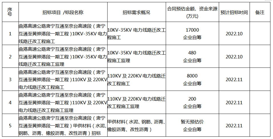為便于投標(biāo)人及時(shí)了解招標(biāo)投標(biāo)信息,根據(jù)《關(guān)于推動(dòng)國(guó)有企業(yè)招標(biāo)人落實(shí)提升招標(biāo)投標(biāo)活動(dòng)質(zhì)量若干措施工作的通知》 (滄審批字(2021)19號(hào))等有關(guān)規(guī)定,現(xiàn)將滄州曲港高速公路建設(shè)有限責(zé)任公司 2022年新增項(xiàng)目招標(biāo)計(jì)劃公開(kāi)如下: